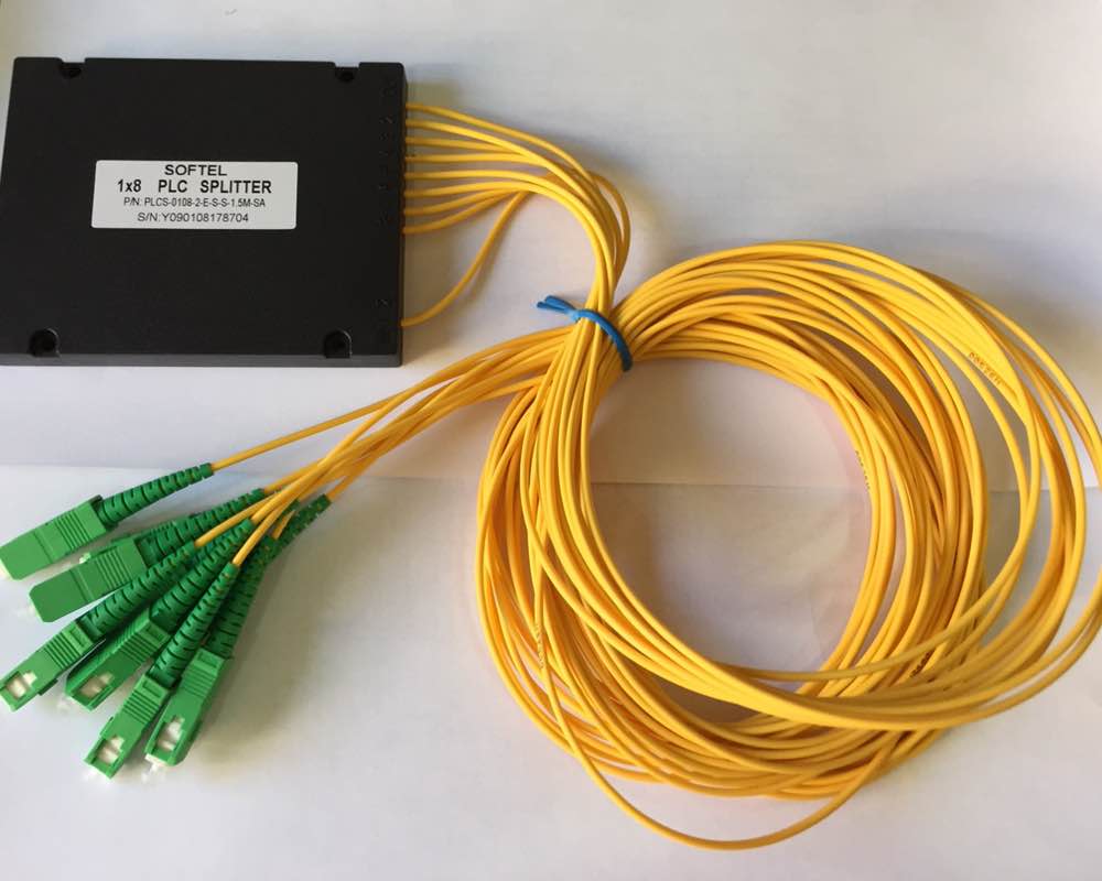 Splitter conectorizado no padrão SC de polimento APC para divisão do sinal óptico proveniente de uma fibra óptica para oito.