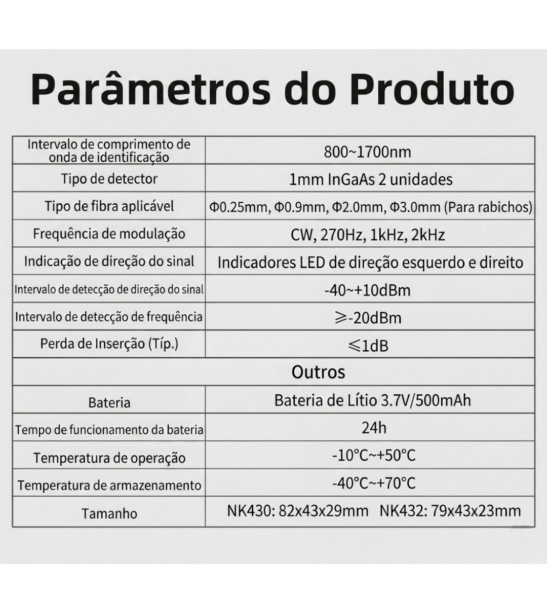 Tipo de detector: 1 mm, InGaAs, 2 peças