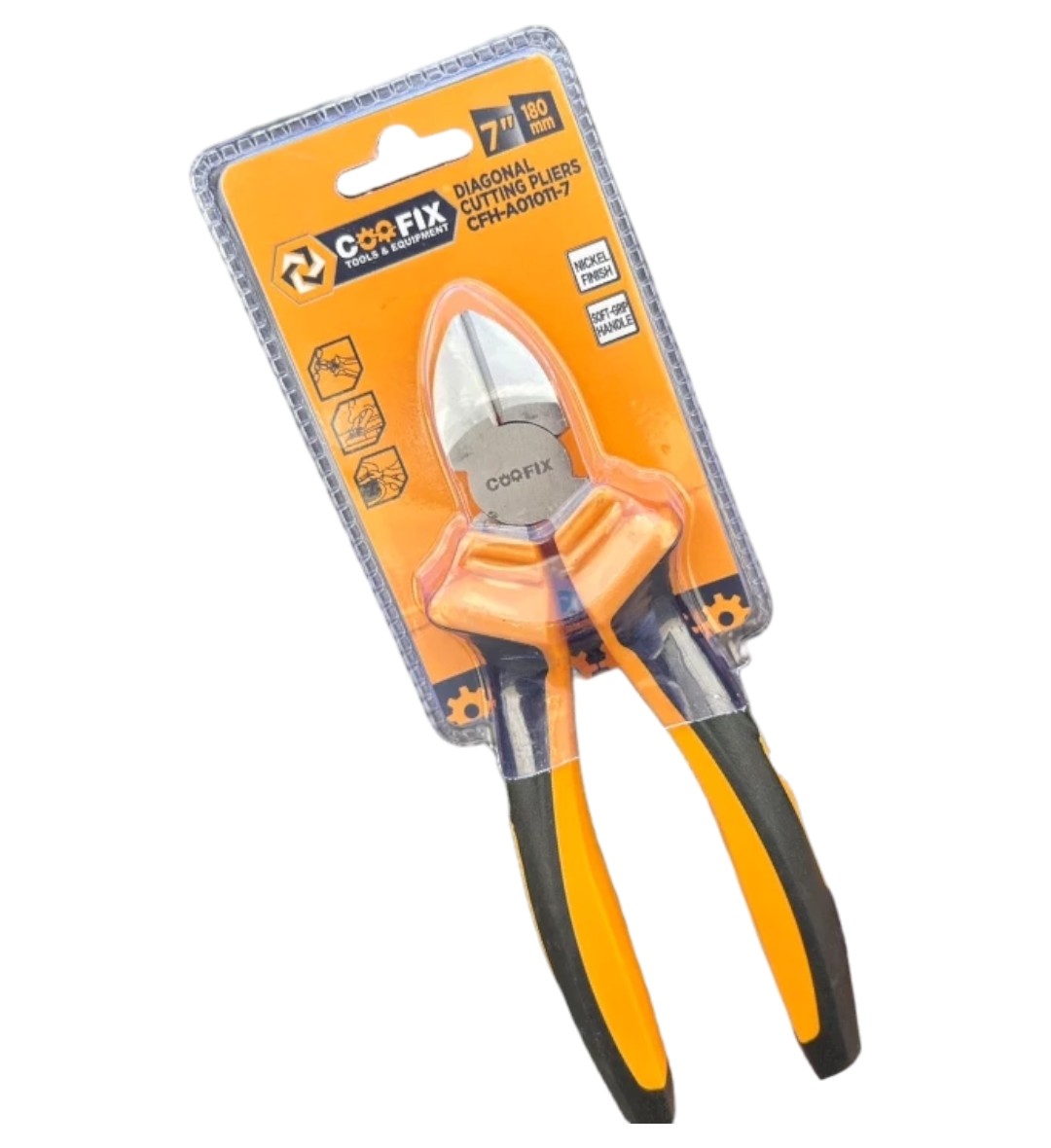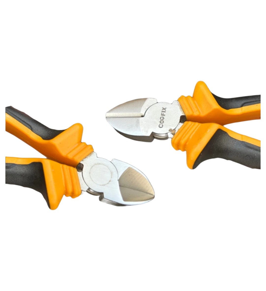 Alicate de corte diagonal de bico longo COOFIX: Características: O design patenteado com mola invisível proporciona maior conforto durante o uso. O usuário não sentirá cansaço mesmo após uso repetido. Reduz a fadiga das mãos. Fabricado em aço carbono cromado. Utiliza um processo parcial de alta frequência para as lâminas de corte.