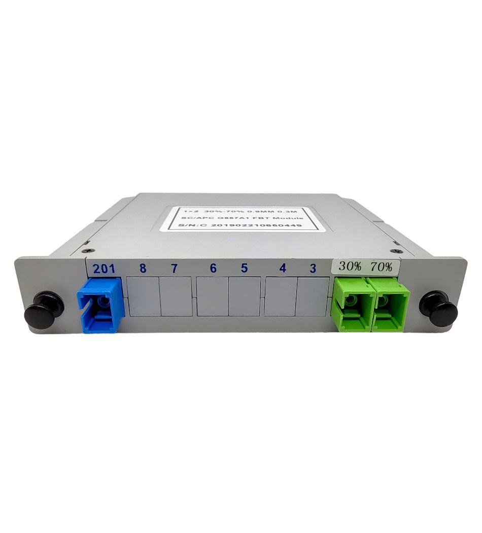 Divisor Óptico FBT SC APC. O divisor óptico é um componente essencial usado na arquitetura de rede FTTH PON, na qual uma única entrada óptica é dividida em múltiplas saídas.