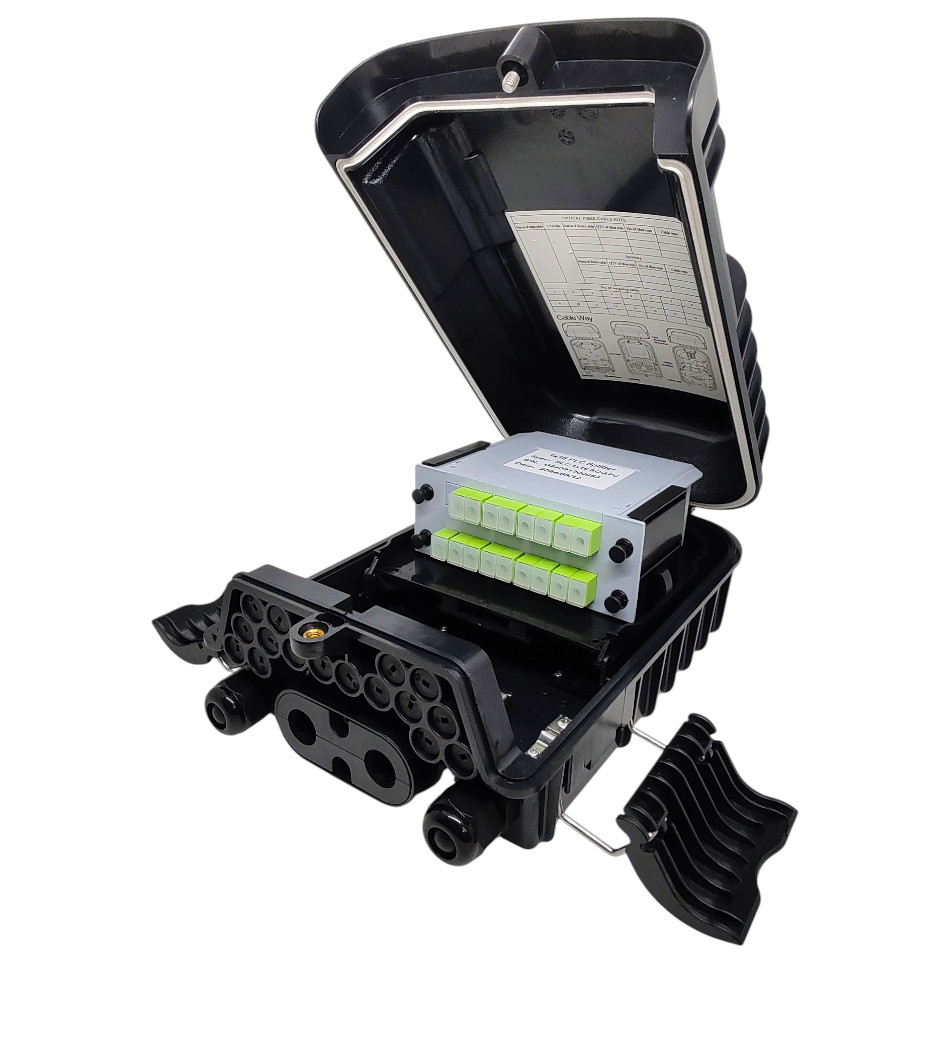 Possui capacidade máxima de 16 assinantes com saídas para mini drop cable,