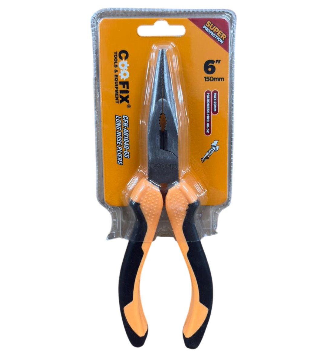 O código CFH-A01040-6S refere-se a um alicate de bico longo da marca Coofix, especificamente o modelo de 6 polegadas (160 mm), feito de aço de alto carbono com cabo de PVC. Ideal para trabalhos de precisão e elétricos