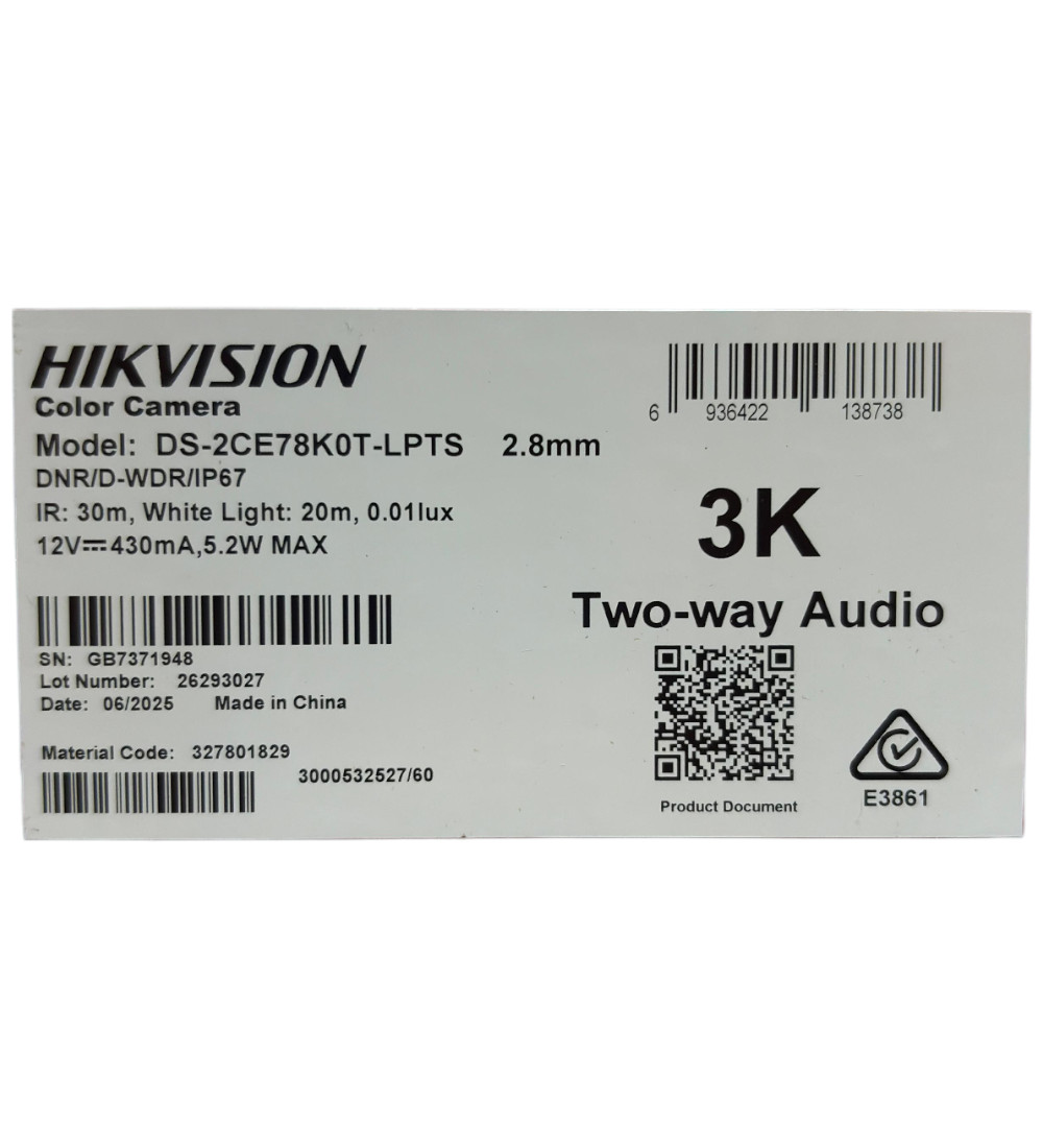 HIKVISION CAMERA HD 3K TURRET DS-2CE78K0T-LPTS AUDIO 2.8MM