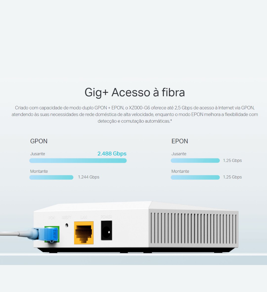 Suporta velocidades de até 2.488 Gbps downstream e 1.244 Gbps upstream, em conformidade com a norma ITU-T G.984 (Classe B+).