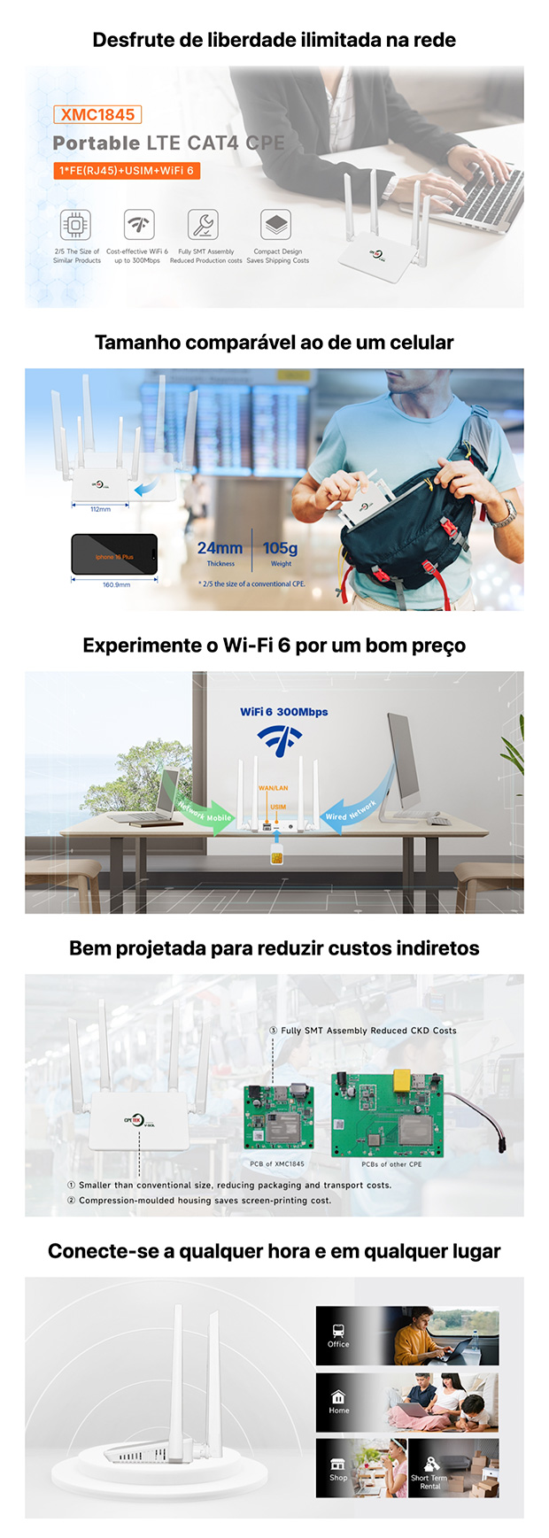 O CPE LTE XMC1845 é um dispositivo compacto (Customer Premises Equipment) que integra tecnologias avançadas como LTE CAT4, hotspot WiFi e LAN Ethernet, sendo ideal para fornecer conectividade em ambientes internos como residências e pequenos escritórios.