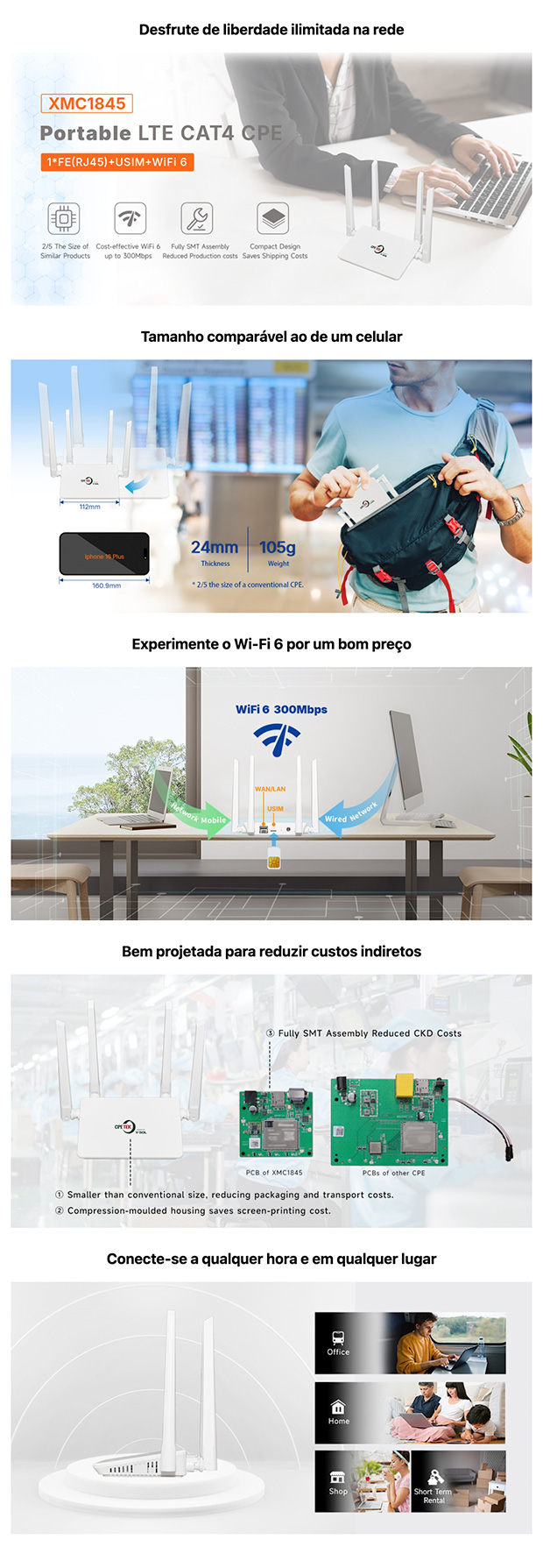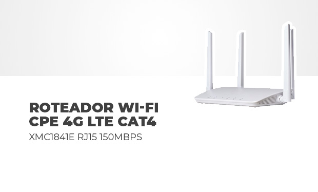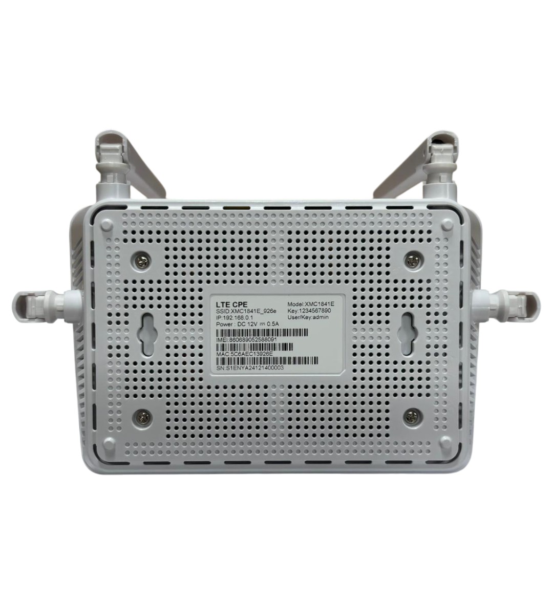 O XMC1841E é um CPE (Customer Premises Equipment) econômico projetado para uso interno, oferecendo conectividade LTE Categoria 4 (CAT4) e Wi-Fi (802.11n). Ele possui 4 antenas externas e fornece uma taxa máxima de download de 150 Mbps.