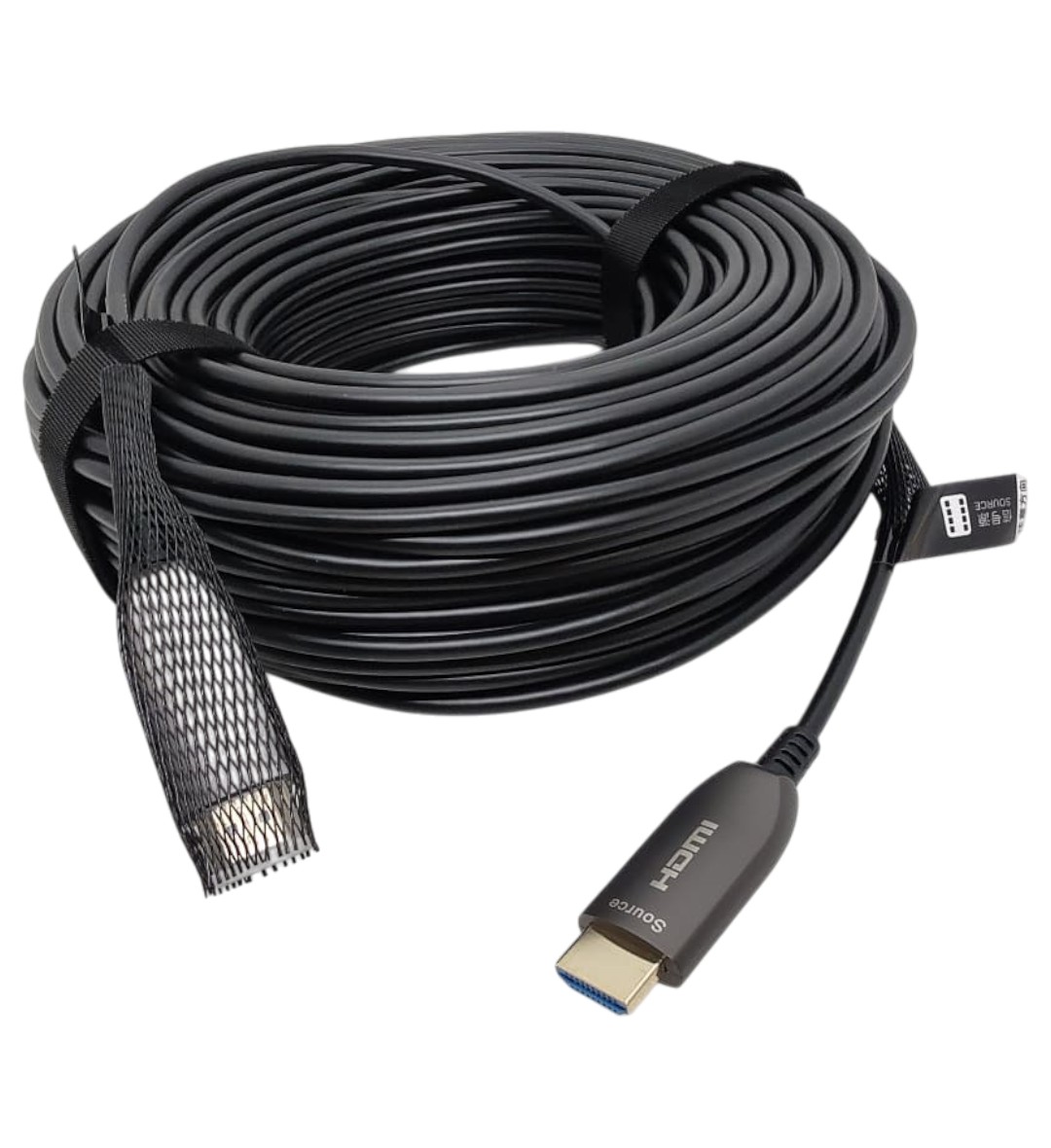 Cabo de fibra óptica HDTV 2.0 com revestimento de alumínio e capa de PVC. Diâmetro externo: 4,3 mm. Condutor: Fibra óptica + BC (cobre). Resolução: 4K, 60 Hz (máx.) 4:4:4