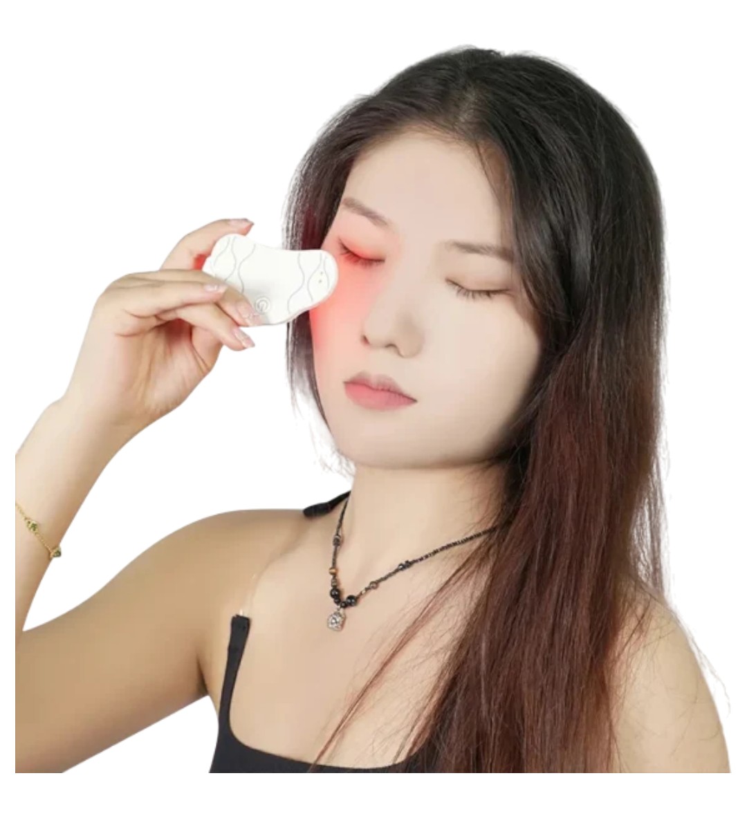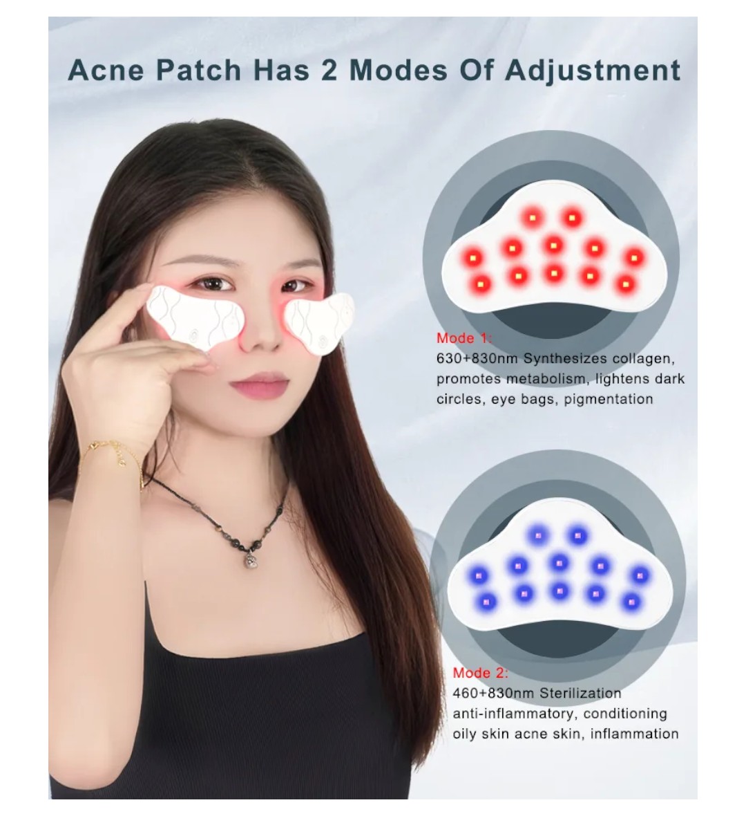 Luz vermelha (630 nm) + Luz infravermelha próxima (850 nm): Estimula a regeneração celular, acelera o metabolismo e reduz olheiras, bolsas sob os olhos e pigmentação.